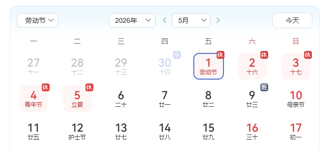 放假時間:2026年5月1日-5日。5月9日(星期六)正常上班。