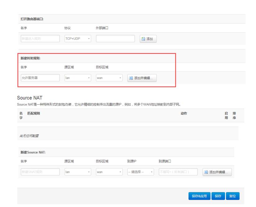 五、 在“新增轉(zhuǎn)發(fā)規(guī)則”處添加規(guī)則名稱(chēng),規(guī)則名稱(chēng)為 “允許服務(wù)器”,并點(diǎn)擊添加并編輯按鈕