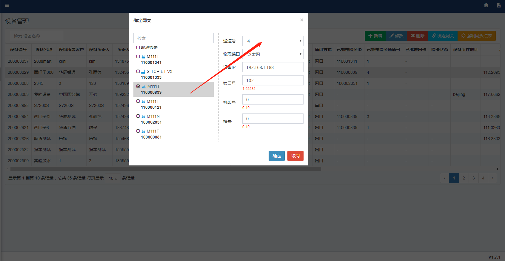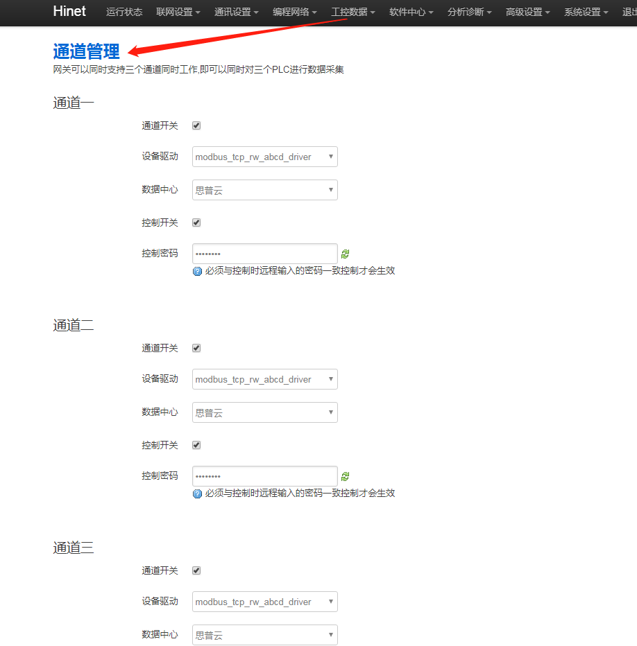 2. 后臺通道與平臺上所選通道不一致,網(wǎng)關(guān)后臺“工控數(shù)據(jù) - 通道管理”打開的是通道1,思普云平臺設(shè)備管理處,設(shè)備綁定網(wǎng)關(guān)時通道選擇1。