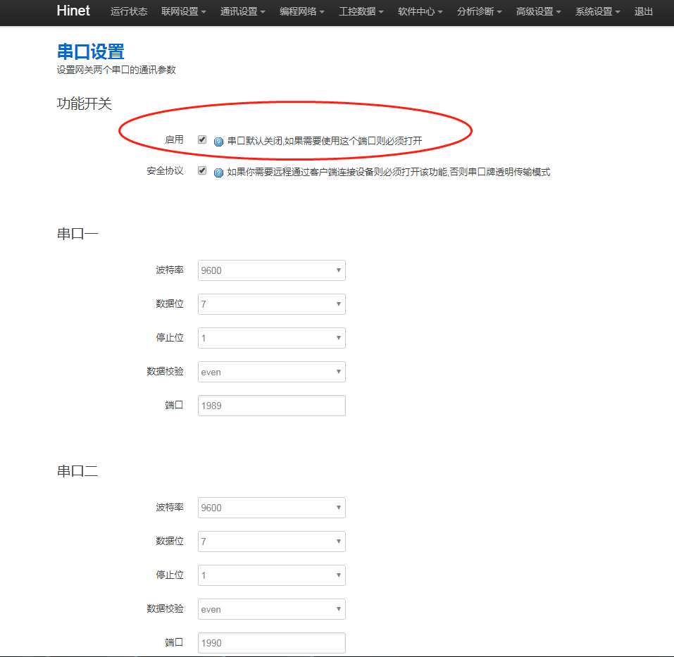 1. 網(wǎng)關(guān)串口功能是否開(kāi)啟,進(jìn)網(wǎng)關(guān)后臺(tái),點(diǎn)擊“通訊設(shè)置 - 串口設(shè)置”,串口勾選【啟用】。