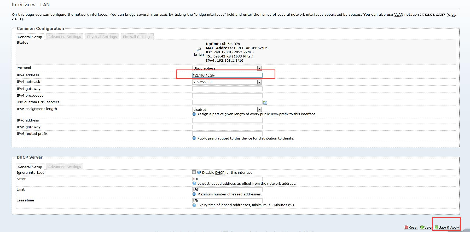 3.7  修改 IP 為 192.168.10.254 并點(diǎn)擊“Save&Apply”。(其他配置均不需要改變)