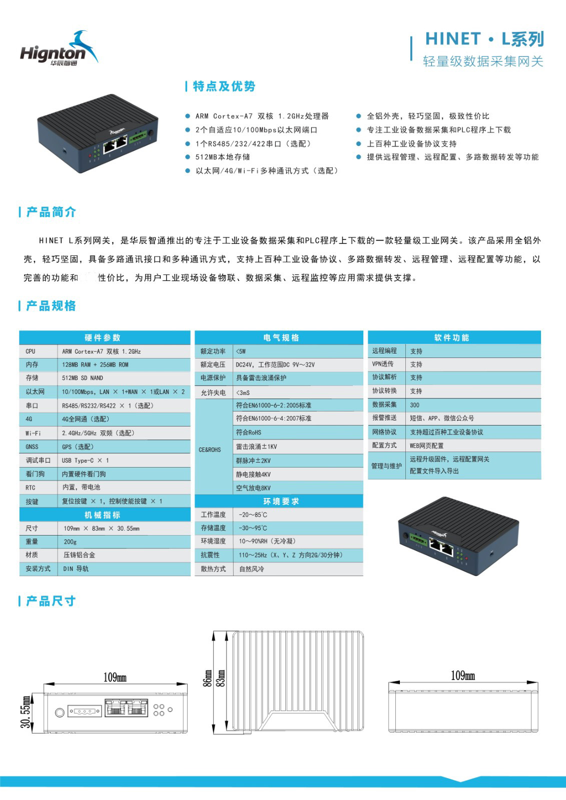 HINET L系列網(wǎng)關(guān),是華辰智通推出的專注于工業(yè)設(shè)備數(shù)據(jù)采集和PLC程序上下載的一款輕量級工業(yè)網(wǎng)關(guān)。該產(chǎn)品采用全鋁外 殼,輕巧堅固,具備多路通訊接口和多種通訊方式,支持上百種工業(yè)設(shè)備協(xié)議、多路數(shù)據(jù)轉(zhuǎn)發(fā)、遠(yuǎn)程管理、遠(yuǎn)程配置等功能,以 完善的功能和性價比,為用戶工業(yè)現(xiàn)場設(shè)備物聯(lián)、數(shù)據(jù)采集、遠(yuǎn)程監(jiān)控等應(yīng)用需求提供支撐。